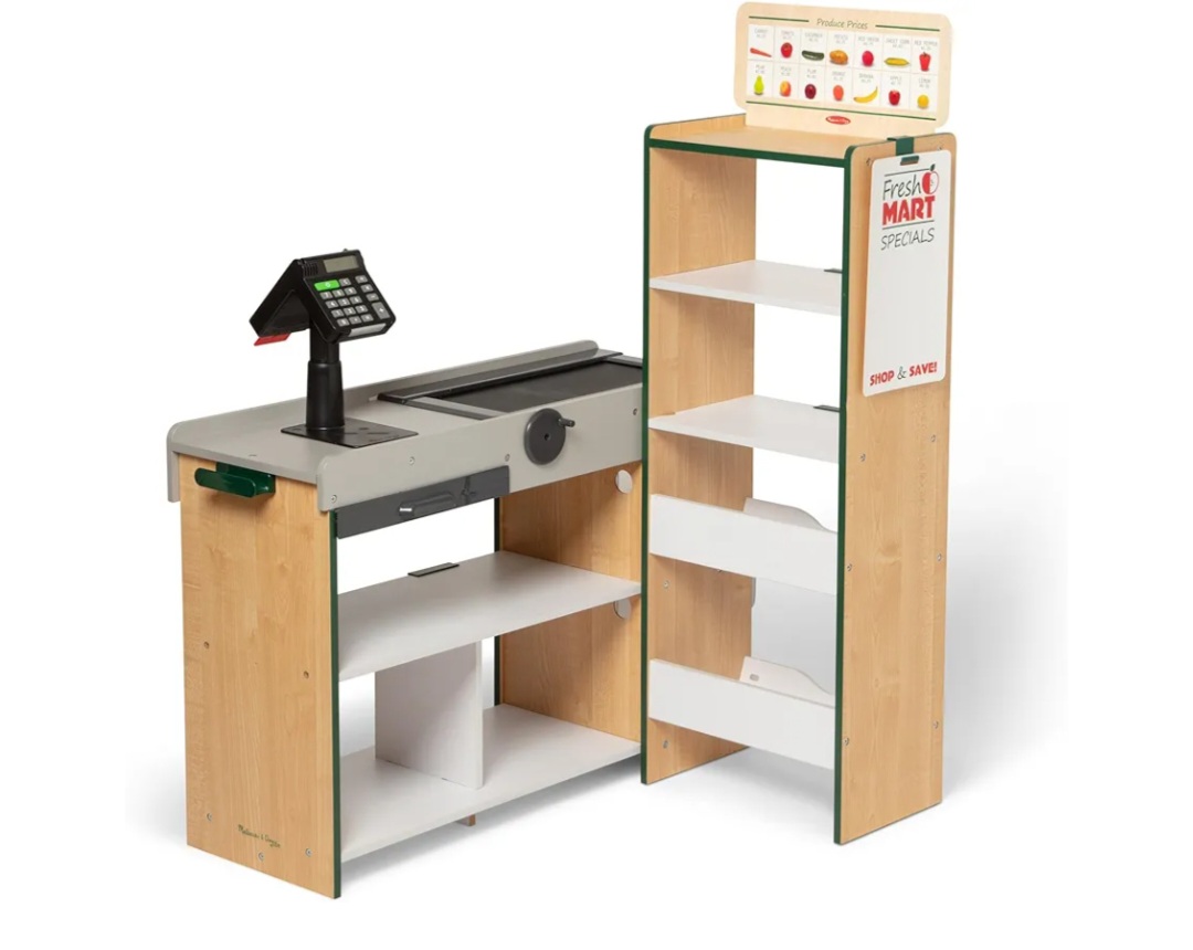 The Melissa & Doug Fresh Mart Pretend Grocery Store is a complete wooden playset that lets kids enjoy a realistic shopping experience. It includes a cash register, scanner, shelves, and a conveyor belt, encouraging imaginative role-play while developing social and early math skills.