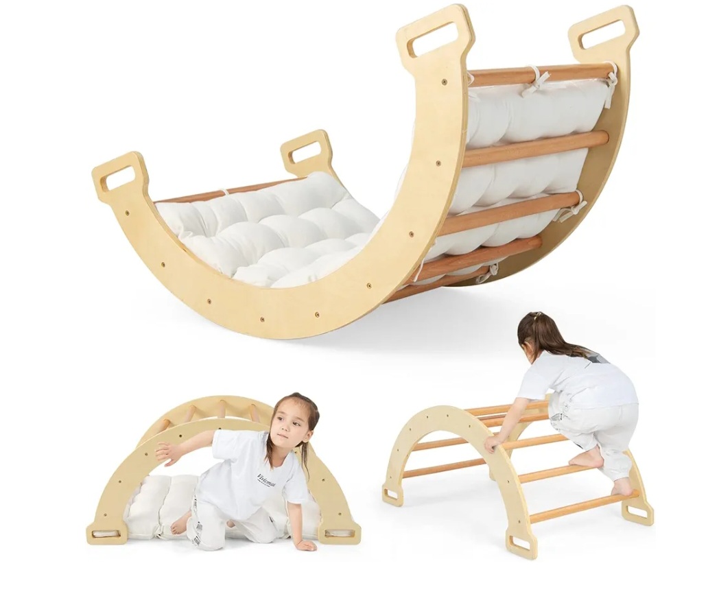 This 3-in-1 Montessori wooden climbing toy is designed to encourage active play while helping toddlers develop balance, coordination, and motor skills. It can be used as an arch climber, ladder, or rocker with a comfortable cushion. Suitable for both indoor and outdoor use, it creates a fun and educational playground experience at home.