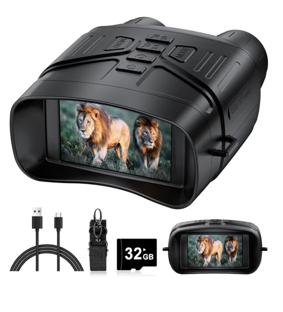 Digital night vision binoculars that capture 4K videos and photos in complete darkness, featuring a large HD screen and a long-lasting rechargeable battery.