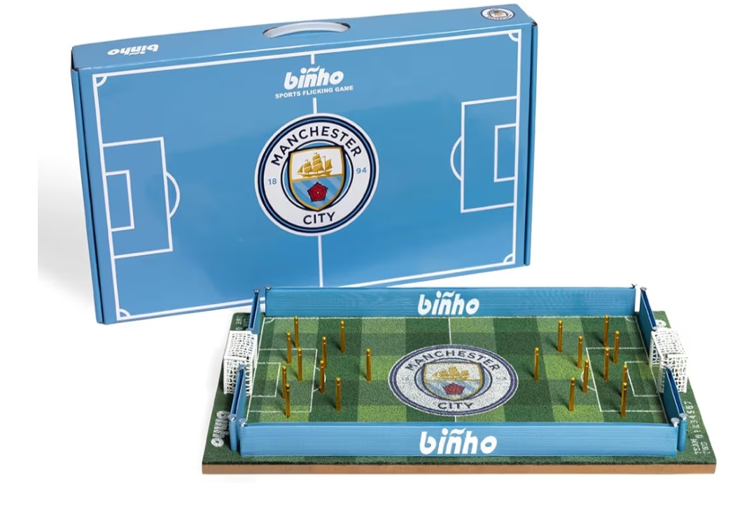 A portable tabletop game where you flick the ball with your finger to score against your opponent, in an official Manchester City edition. Perfect for family and friends.