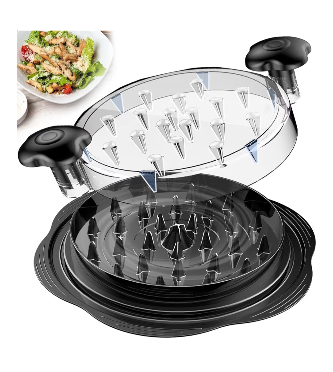 A kitchen tool designed to quickly and easily shred cooked meat by twisting the lid, delivering evenly shredded results with minimal effort.