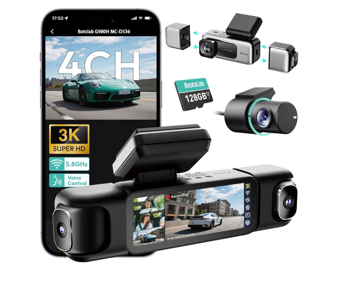 The BOTSLAB 3K 4-Channel Dash Cam (G980H) is a complete in-car surveillance system that provides a 560° all-around view using four cameras (front, rear, and inside coverage). It captures everything happening inside and outside your vehicle in high clarity.