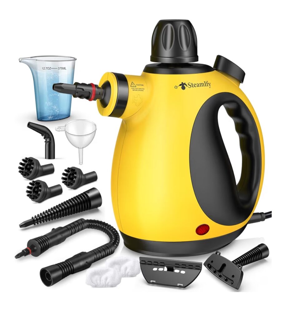 A portable, pressurized handheld steam cleaner designed for multi-surface home use. It delivers high-temperature steam without chemicals to clean solid and fabric surfaces such as tiles, marble, windows, furniture, car seats, tight corners, and more. It comes with a full set of accessories (about 12 pieces) to help reach narrow areas and perform various cleaning tasks efficiently.