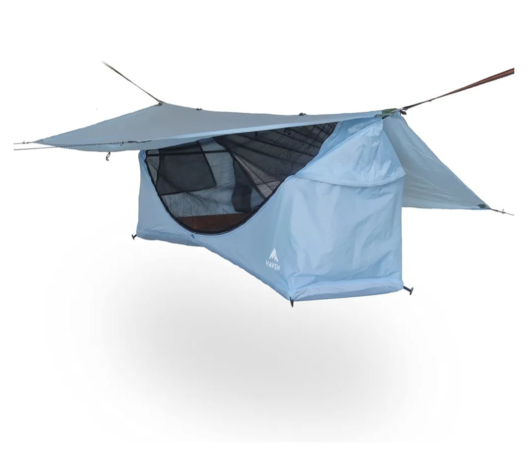 A suspended lay-flat hammock tent that provides a level sleeping surface with built-in insulation, rain protection, and a mosquito net — all in one ready-to-camp system.