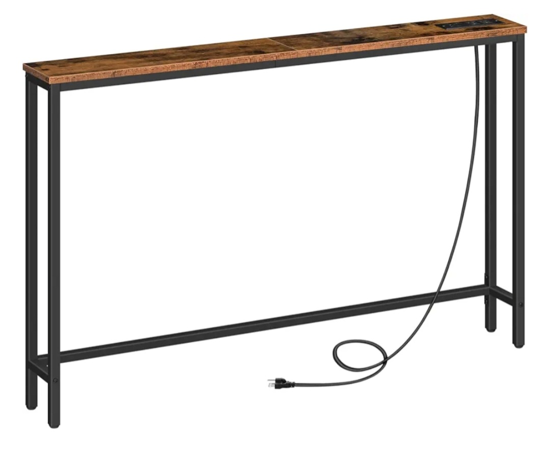 A slim, long console table for hallways or behind the sofa, featuring a built-in charging station (power outlets + USB ports) for easy device charging.