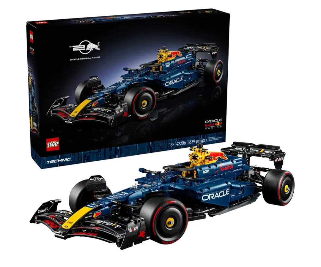 A LEGO Technic building set designed for adults (18+) that lets you assemble a highly detailed replica of the Oracle Red Bull Racing RB20 Formula 1 car. This model features realistic engineering elements and consists of 1,639 pieces, built at a 1:8 scale, showcasing authentic mechanical details such as the engine, steering, and drivetrain.