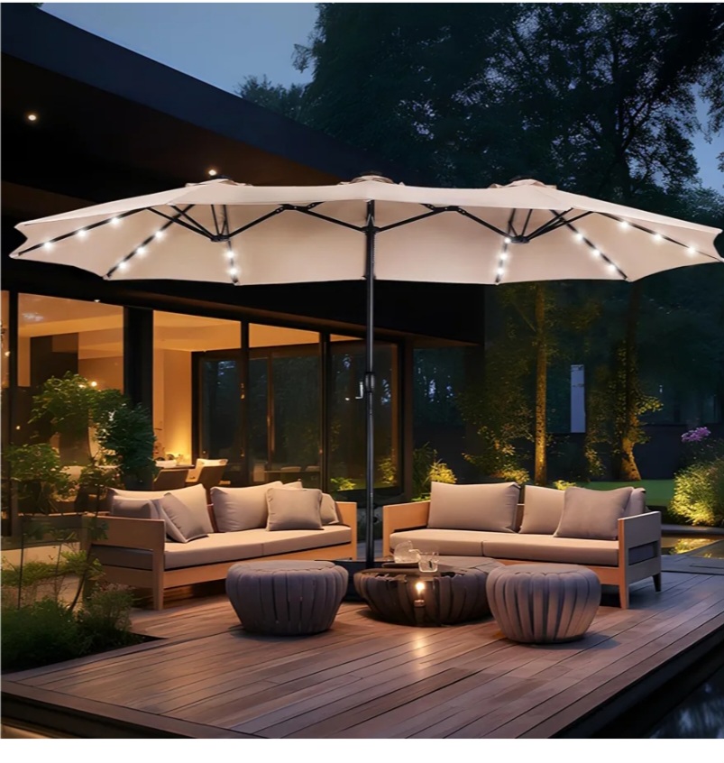 This is a large double-sided outdoor patio umbrella suitable for gardens, decks, or poolside areas. It features solar-powered LED lights for nighttime illumination without needing electricity. The umbrella comes with a base for stability and uses a crank handle system for easy opening and closing.