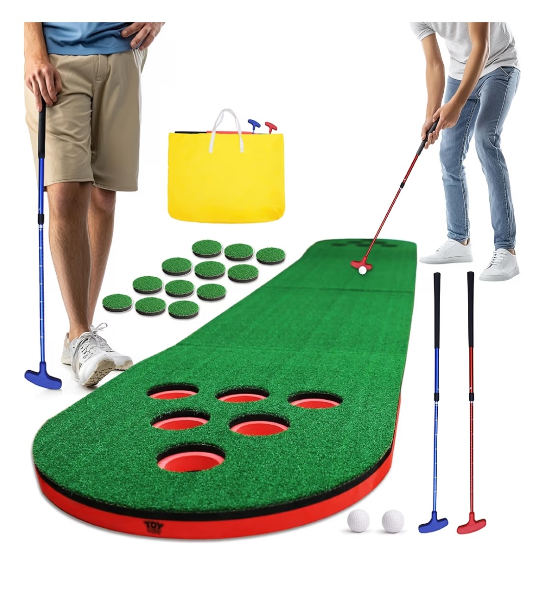 A fun and practical mini golf putting set featuring a 10-ft green mat, two putters, and two balls—perfect for practicing at home or enjoying friendly games indoors or outdoors.