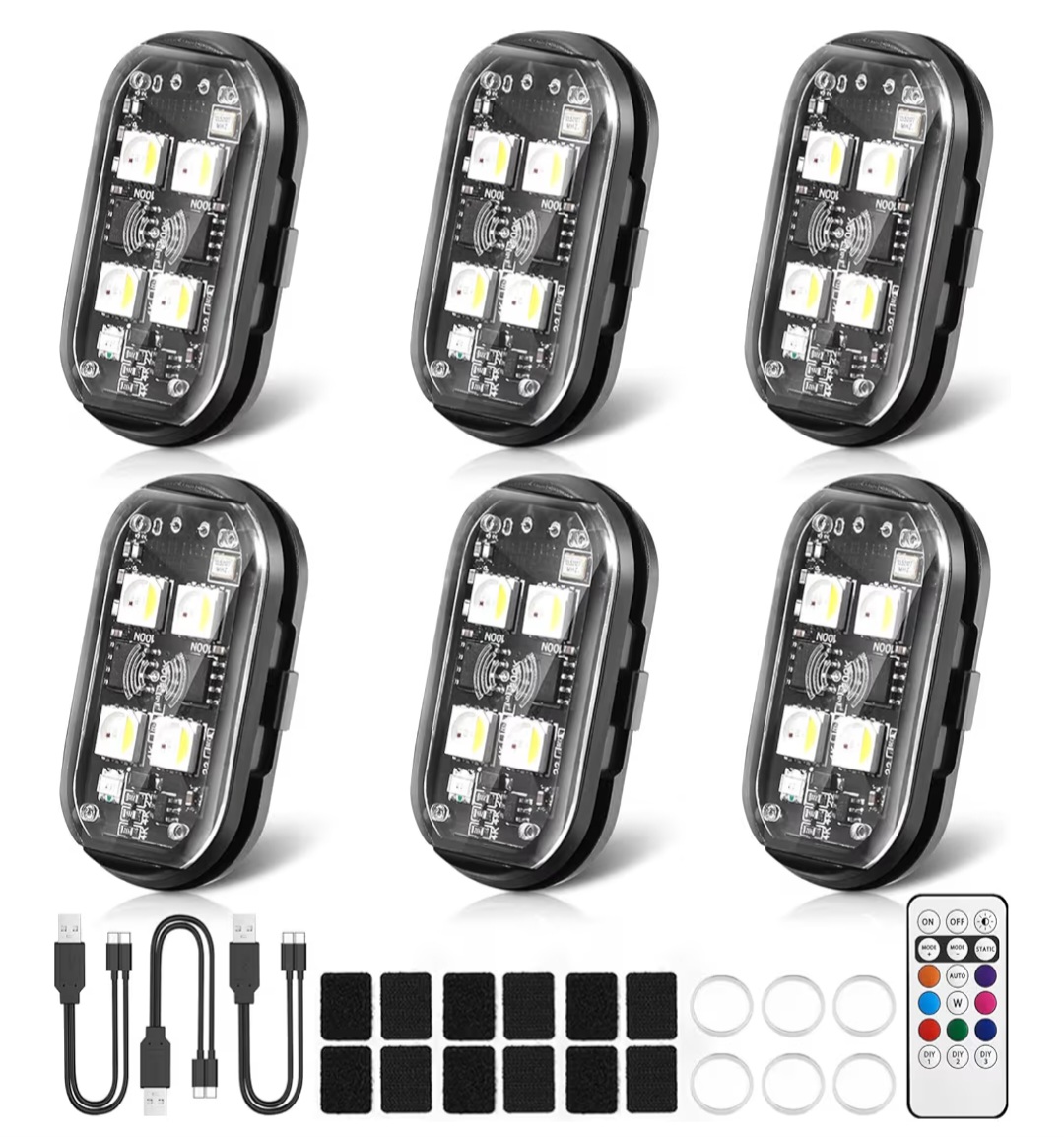 An upgraded wireless LED strobe light set including 6 pieces, each equipped with 4 high-brightness LEDs, offering 8 different colors and 10 lighting modes controlled remotely.
