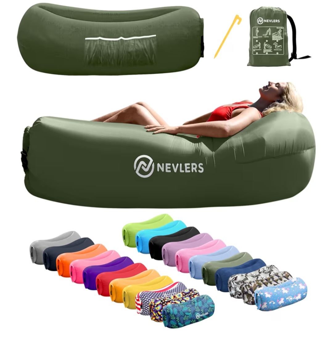 The Nevlers Inflatable Lounger is a portable inflatable chair/sofa made from durable 210T polyester. It inflates easily without a pump by capturing air, making it ideal for outdoor and indoor relaxation such as at the beach, camping, the garden, or at home.