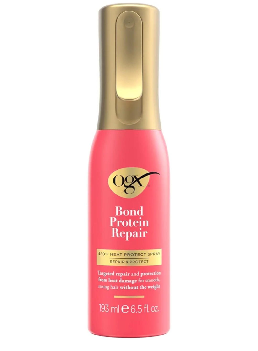 The OGX Bond Protein Repair Bundle is a hair care set that includes a heat protection spray and a sealing hair serum. It is designed to protect hair from heat damage caused by styling tools such as blow dryers and flat irons, while helping to repair, strengthen, and revitalize dry or damaged hair using a protein-rich formula.