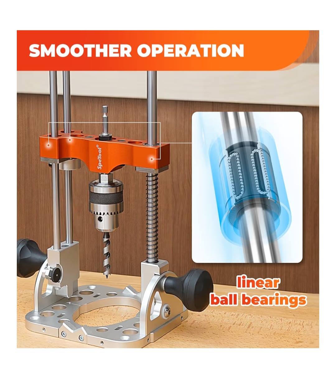 A tool that attaches to a hand drill to turn it into a precision drilling platform, allowing straight or angled drilling from 0° to 60° with high stability.