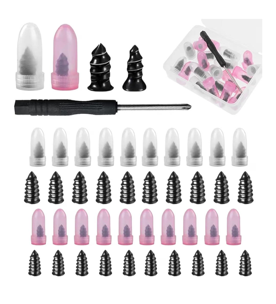 A quick tire repair kit for tubeless tires, using rubber screw-in nails for easy self-service repair without removing the wheel.