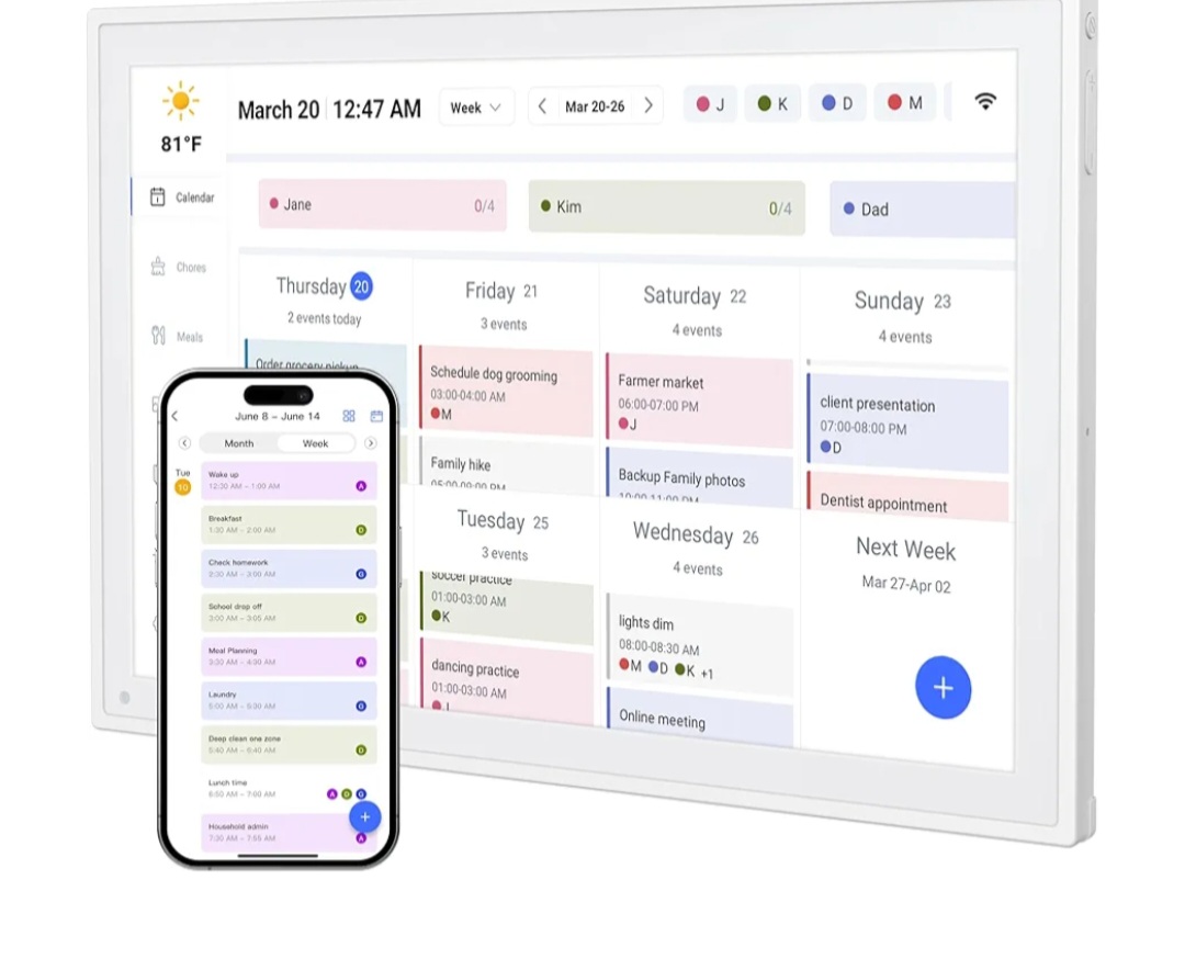 This 15.6-inch smart digital calendar features a 1080P Full HD interactive touchscreen, designed to help families organize schedules, appointments, and daily tasks with ease. It works as an all-in-one smart family planner and can be switched into a digital photo frame to display your favorite memories when not in planning mode. Its flexible design allows both wall mounting and desk placement.