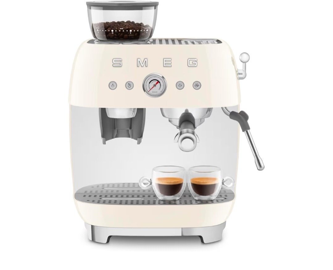 The Smeg EGF03 is a semi-automatic espresso machine with a built-in coffee grinder and a dual heating system, designed to prepare café-quality espresso at home with an elegant 1950s-inspired look.