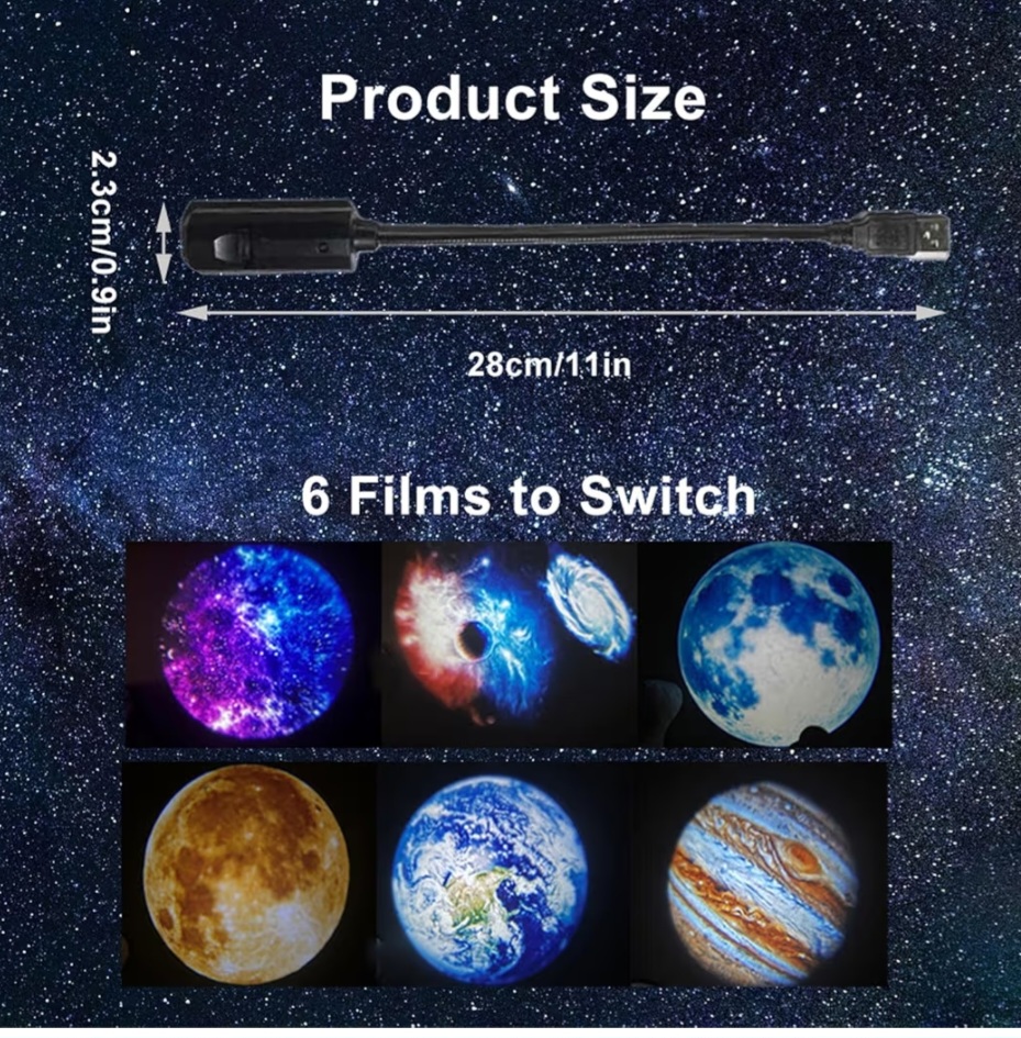 An innovative night projector lamp that transforms any room into a stunning cosmic scene, displaying the moon, Earth, Jupiter, and starry skies in a full 360° projection. It comes with multiple film discs to easily switch atmospheres, making it perfect for relaxation, decoration, or capturing eye-catching photos.