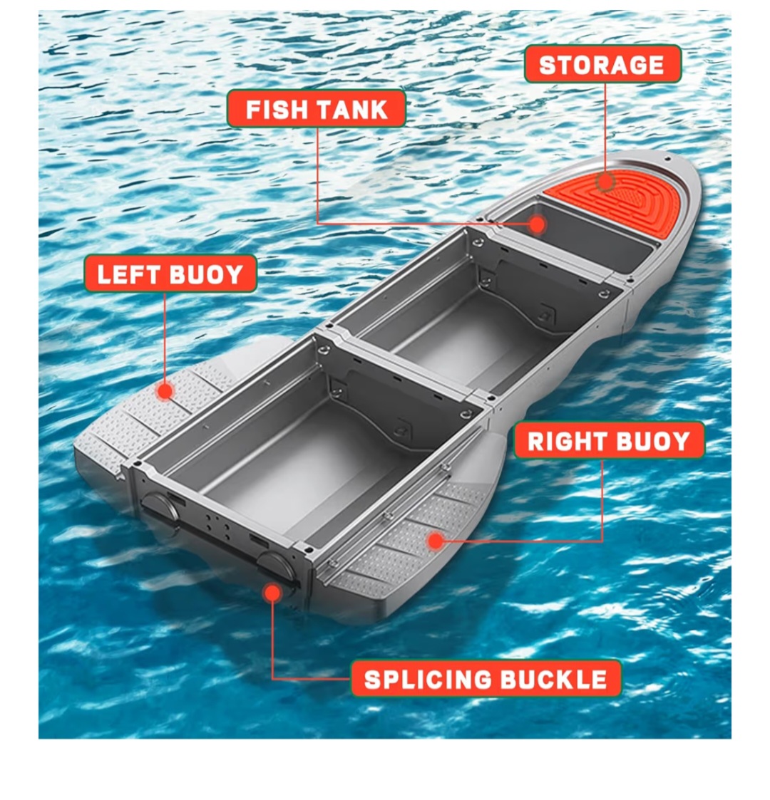 A multi-functional, foldable pontoon fishing boat made of 3 modular boats with 2 pontoons, supporting up to 1300 lbs and fitting 4–6 adults. Equipped with a fish tank and designed for fishing, hunting, rescuing, and touring.