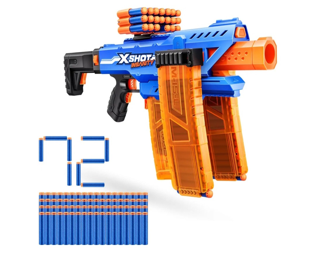 This is the XSHOT Insanity Motorized Clip Mania Dart Blaster, a fully motorized dart blaster toy from the brand ZURU, designed for outdoor play and competitive fun with friends and family. It features a motorized firing system that launches darts quickly without manual effort and comes with 72 Air Pocket Technology darts for enhanced performance.